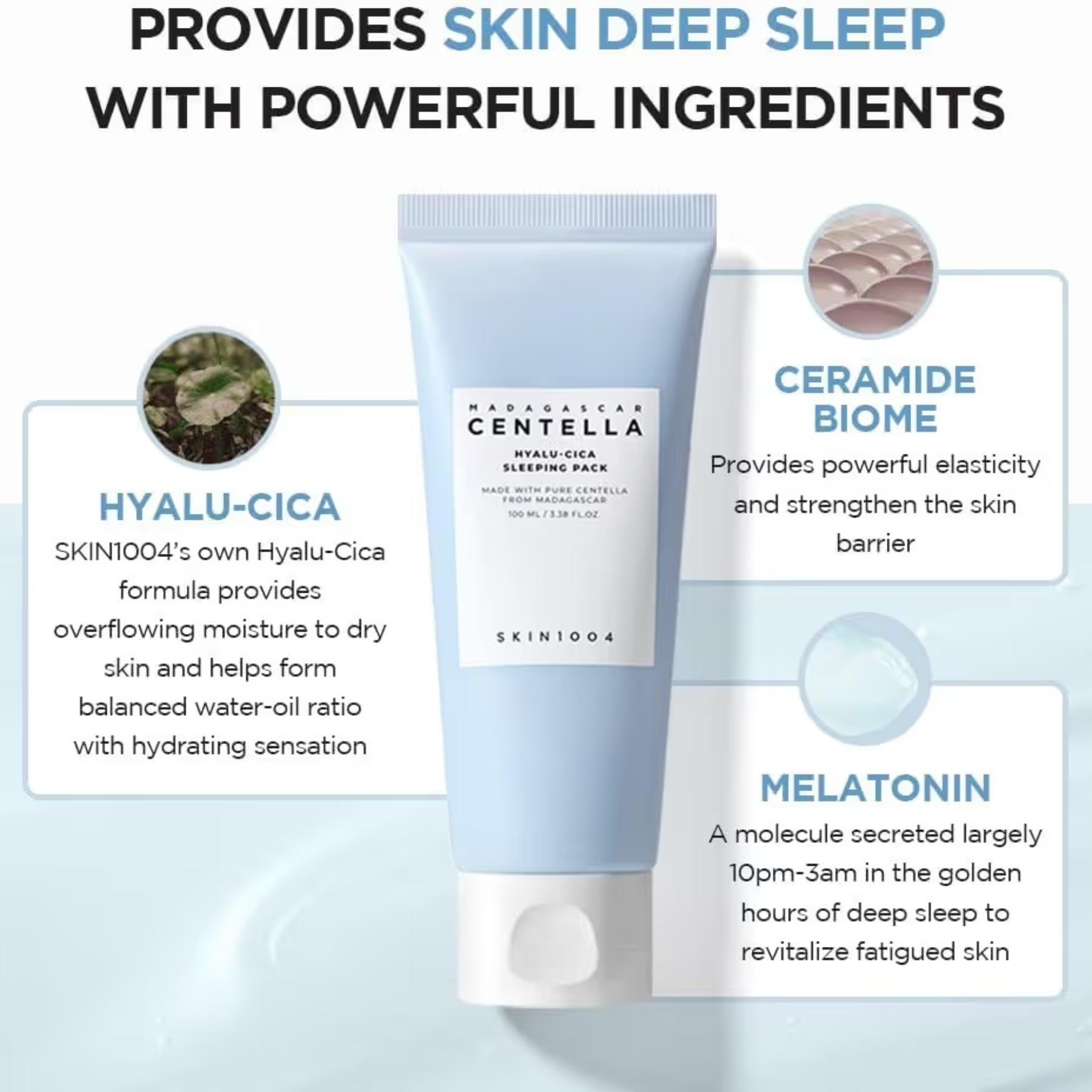 A deeply hydrating overnight mask enriched with Centella extract and hyaluronic acid to repair skin barrier and replenish moisture overnight. Wake up with smoother, refreshed skin.